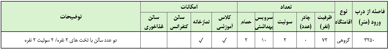 این اقامتگاه در مجاورت سالنها و زمینهای ورزشی قرار گرفته و مهمانان می توانند به استخر، زمین فوتسال، سالن ورزشی سرپوشیده، پینتبال، تیراندازی و زمین چمن مصنوعی دسترسی داشته باشند. بخش خوابگاهی آن شامل سالنهایی با تختهای دوطبقه مرتب برای استراحت گروهها است. همچنین، مجموعه دارای نمازخانهای مجهز برای انجام عبادات و فضایی صمیمی برای اقامت میباشد.